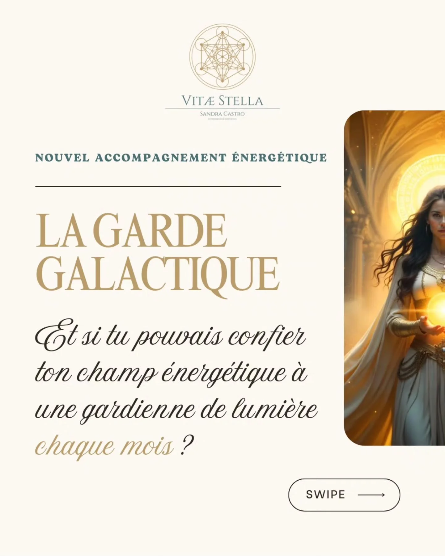 C’est pourquoi je crée aujourd’hui La Garde Galactique : un abonnement pour prendre soin de ton énergie en profondeur, te libérer et t’élever.
